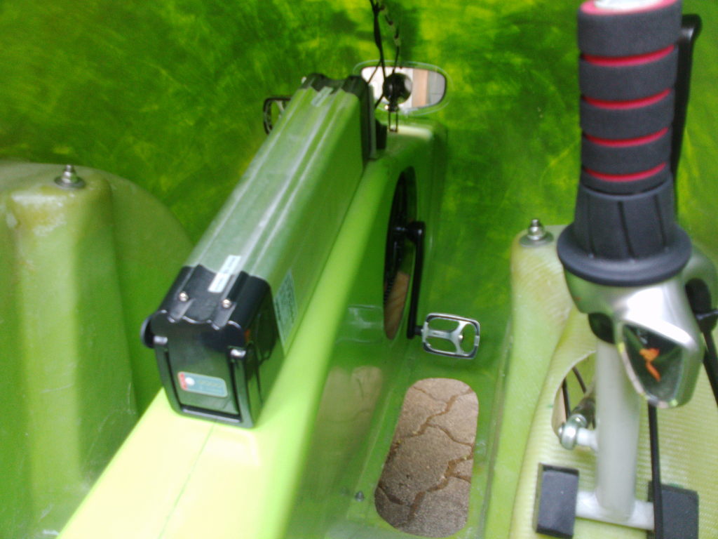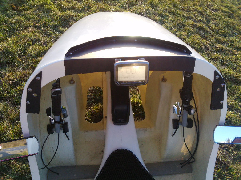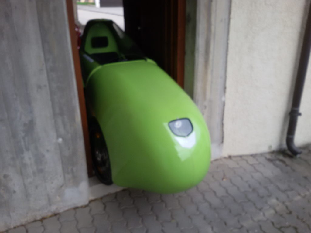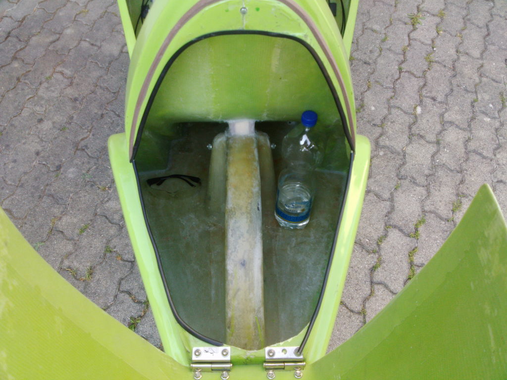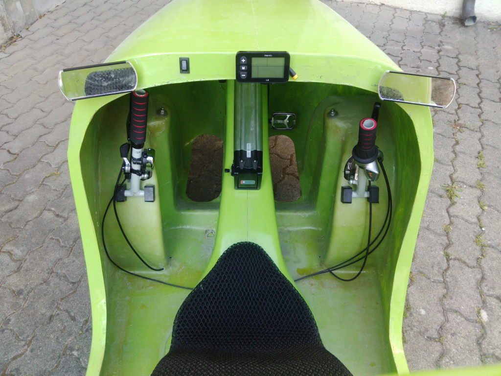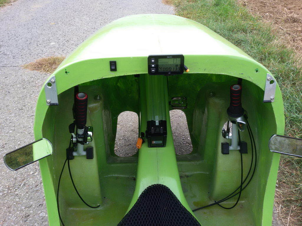 ... ist die offene Variante für Frischluft-Freunde. Der Fahrer genießt unmittelbaren Kontakt zur Natur, ist aber trotzdem vor dem Fahrtwind, vor Spritzwasser und bis zur Brust auch vor Regen geschützt. In Verbindung mit der bequemen Sitzposition erreicht der Fahrer mit sauberer Kleidung und ohne eingeschlafene Gliedmaßen sein Ziel. Nebenbei ist der Luftwiederstand ist geringer als z.B. bei einem „normalen“ Fahrrad. Das Gepäckfach ist abschließbar